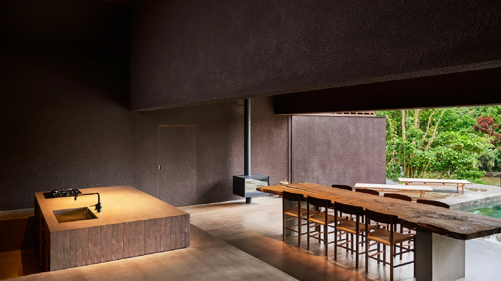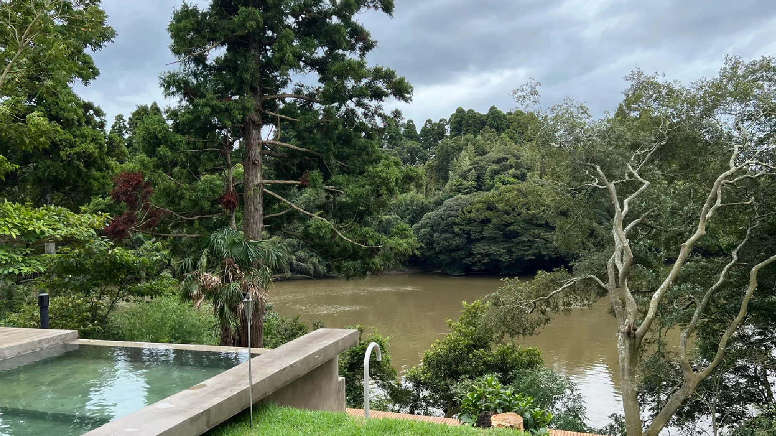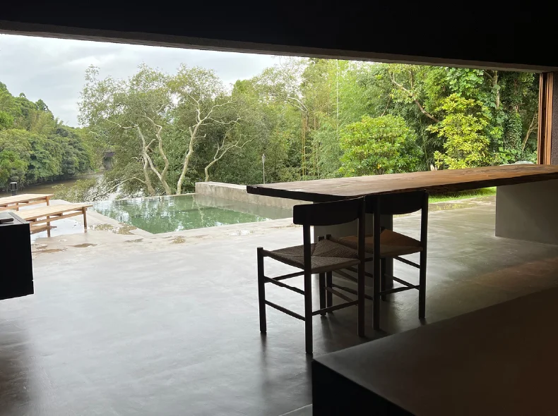 施設に一歩足を踏み入れると、そこは自然と一体化した特別なプライベート空間。大きな開口によって屋内と屋外がシームレスにつながり、開かれたテラスの目の前に流れる川の景色が広がっています。