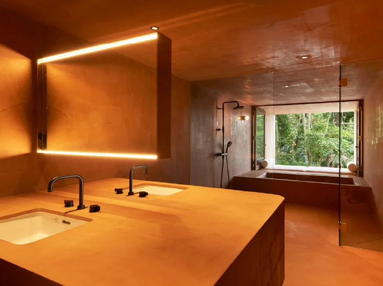 例えば、この施設には冷房設備はありません。理由は、窓を閉めることによって“外との親密性”が遮断されてしまうからです。敢えてリモコン一つで空調が管理できてしまう環境にはせず、暑ければ大きく窓を開け、目の前にあるプールに足をつけて体を冷やし、寒い時は薪ストーブに火をつけて部屋全体が暖まるのを待ちます。便利なハードやソフトをあえてカットし、自然と一体化した空間だからこそ味わえる貴重な体験を、真のラグジュアリーとして提供する施設なのです。
