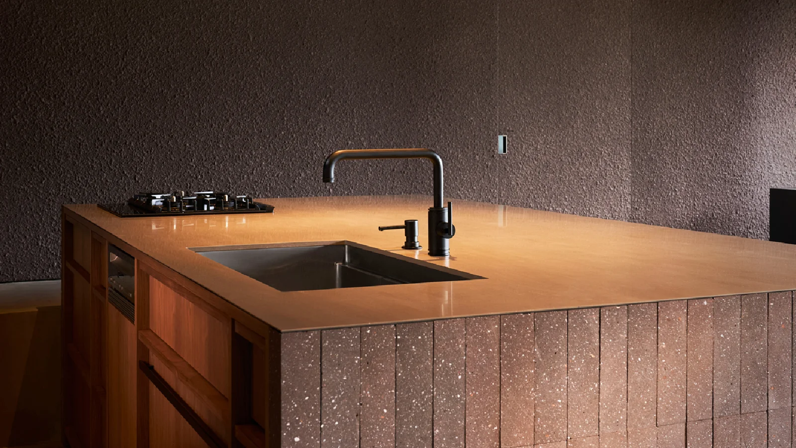 シンプルなデザインかつ自然の彩色に溶け込むブラックカラーの水栓