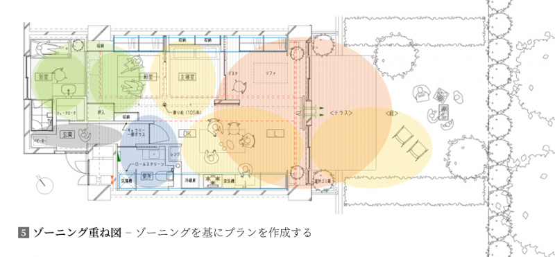 ゾーニングとは、空間を機能や用途別にそれぞれに必要な空間の大きさを設定し、敷地、建物の特性や相互の関連を考慮し、空間の中での位置を決めていく手法である。